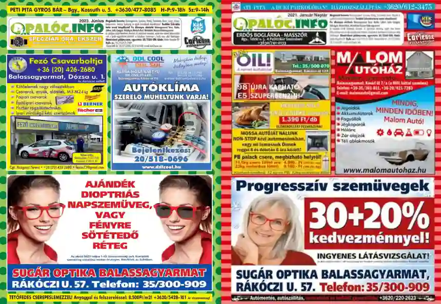 A Palóc Infó több mint 33 éve szolgálja Balassagyarmat és térsége vállalkozásait. Ez idő alatt több száz partnerünk jelentette, jelenteti meg hónapról-hónapra hirdetését újságunkban. “A reklám az új évezred cégére.” A vásárlók látják, hogy vállalkozások, kezdeményezések gyorsan kifulladnak, megbízhatatlanná válnak. Hirdetőink folyamatos jelenléte azt üzeni, hogy Ők és csapatuk hosszú távon állandó és megbízható minőséget kínálnak. Ha szeretne nálunk hirdetni, örömmel vesszük keresését! Megjelenünk havonta: Balassagyarmat, Szécsény, Rétság, Szendehely, Rimóc, Szügy, Patvarc, Nyírje puszta, Varsány, Ipolyszög és a környékbeli településeken valamint Szlovákia határmenti településein! A/4 méretben, 4-8-12 színes oldalon.